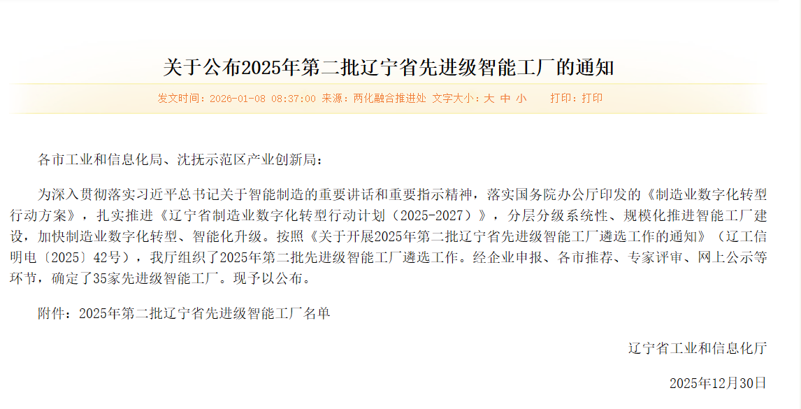 近日,遼寧省工信廳開展了2025年第二批先進(jìn)級(jí)智能工廠遴選工作。經(jīng)企業(yè)申報(bào)、各市推薦、專家評審、網(wǎng)上公示等環(huán)節(jié),確定了35家先進(jìn)級(jí)智能工廠。